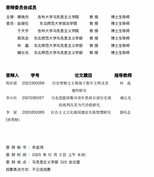 东北师范大学马克思主义学部马克思主义基本原理专业博士研究生学位论文答辩、预答辩公告