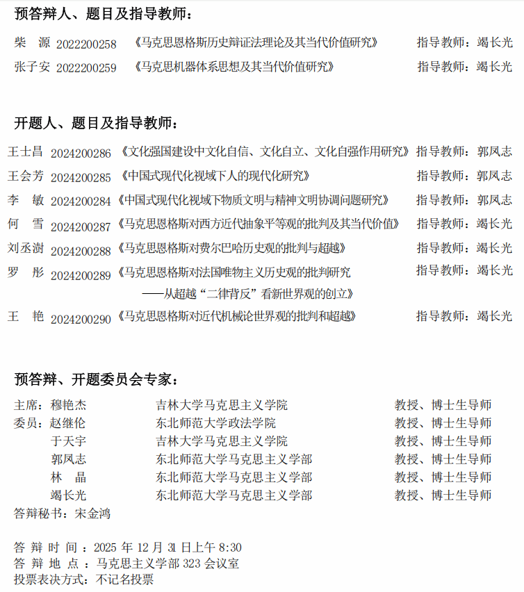2025年东北师范大学马克思主义学部马克思主义理论专业博士学位论文预答辩暨开题公告